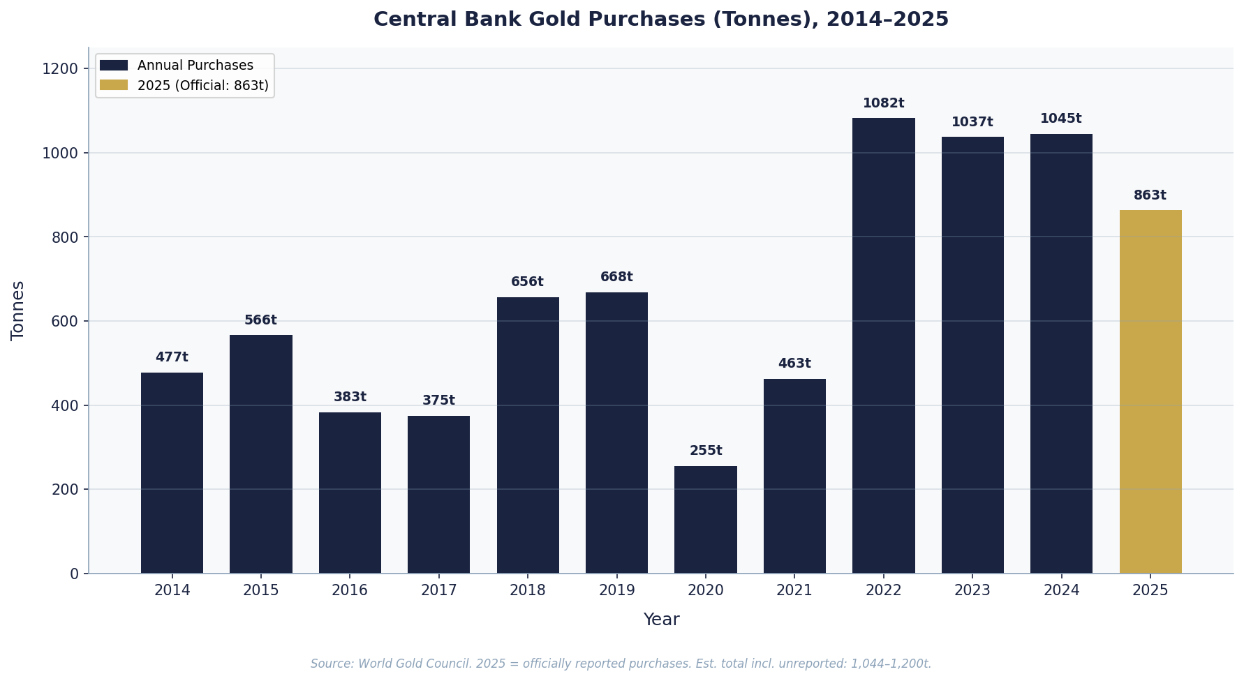 - Central banks added 863 tonnes of gold in 2025, with 43% planning further increases and 0% planning decreases — a structural demand floor independent of geopolitical cycles.