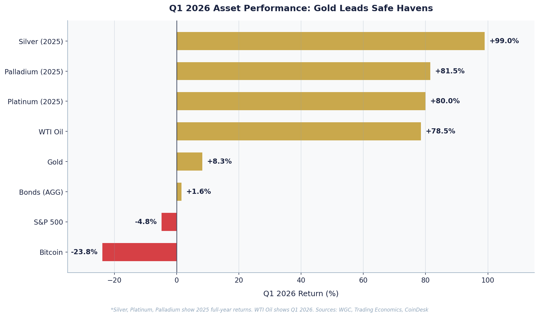 This divergence is instructive. Gold is a forward-looking monetary asset. Oil is an energy commodity with real-time supply sensitivity. In Q1, both confirmed the same geopolitical thesis, just on different timelines.